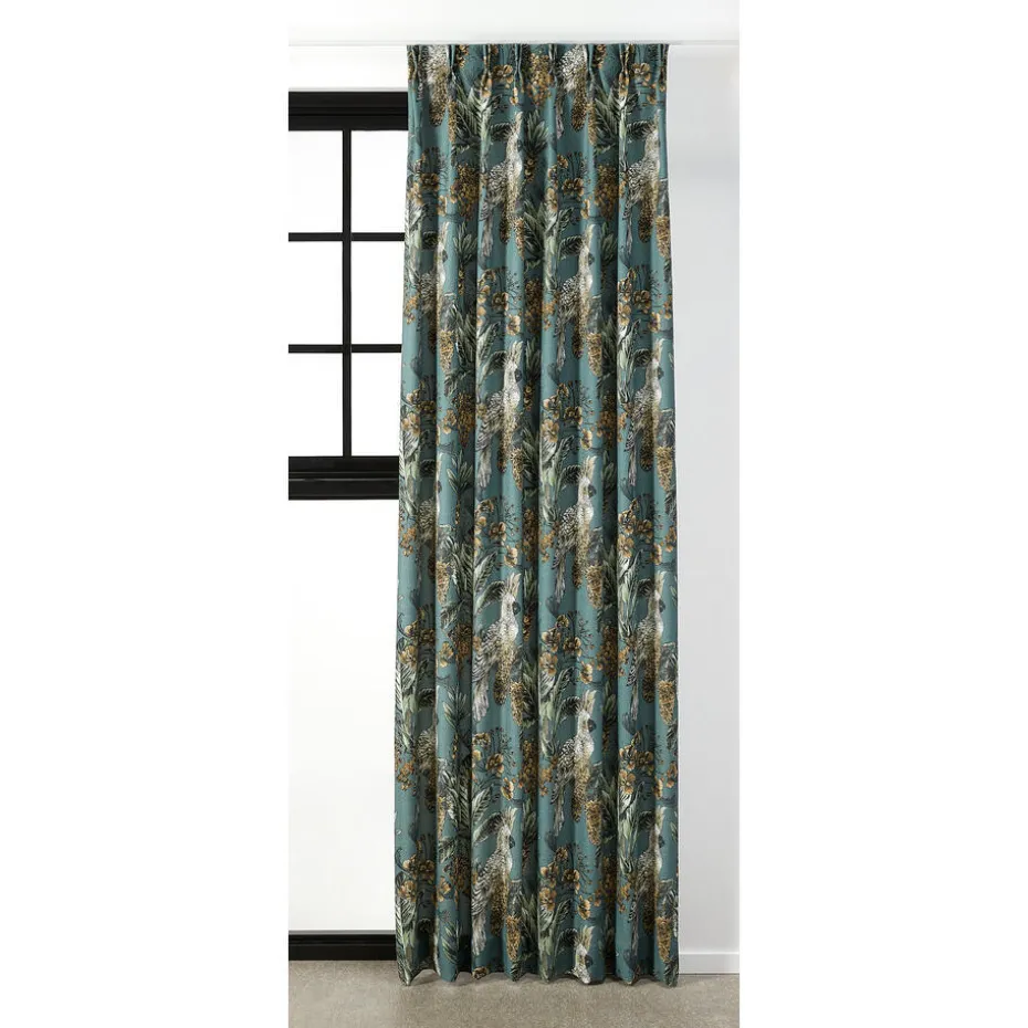 Gordijn Karin in een blauwe kleur. Dit gordijn heeft een print van bloemen en vogels. De stof is gemaakt van 70% polyester, 21% gerecycled katoen en 9% katoen. Het patroonhoogte is 65 centimeter. 145 centimeter breed.